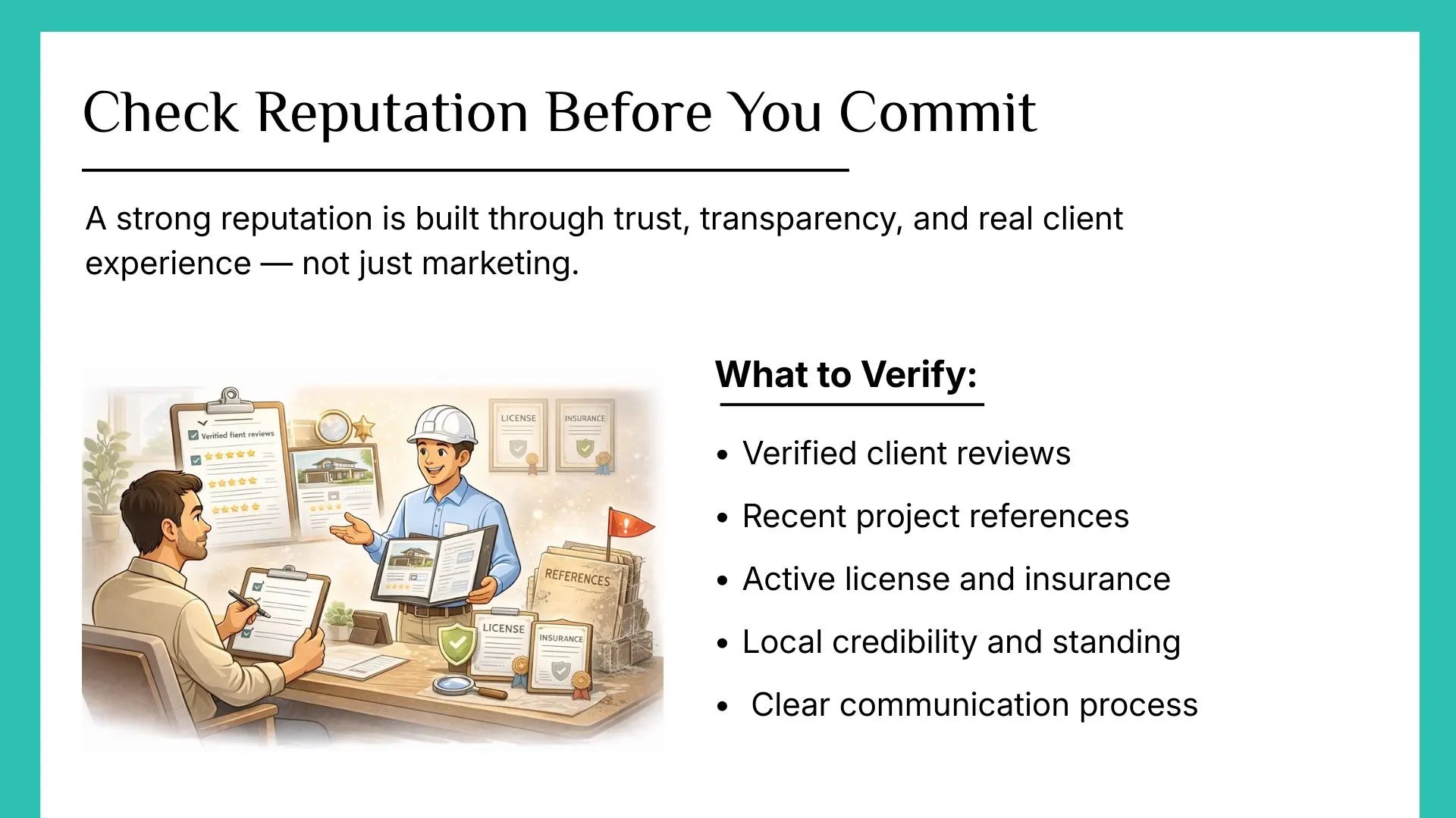 Past clients often reveal insights about communication, accountability, and post-construction support — details that matter long after move-in day.