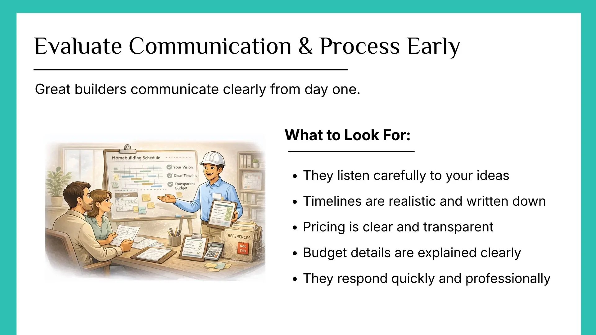 A builder who specializes in production homes may struggle with a high-end custom vision. Clarity upfront ensures alignment and avoids costly redesigns later.
