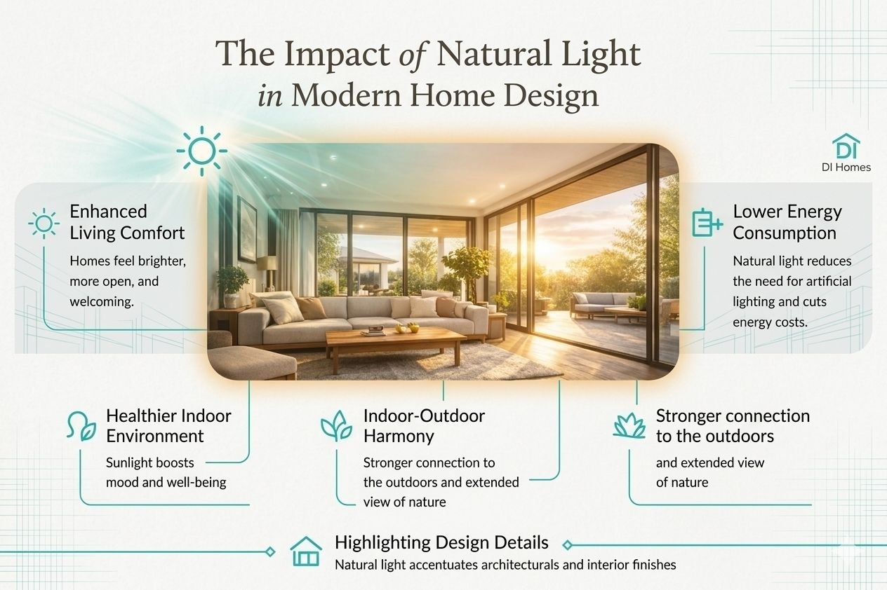 Natural light plays a crucial role in creating comfortable, visually appealing homes. From proper home orientation and larger windows to open layouts, skylights, and reflective materials, every design decision affects how daylight flows through a space. Thoughtful planning during the home design stage allows builders and designers to create brighter interiors that feel more open and connected to the outdoors. When natural light is integrated effectively, it enhances daily living while improving both the beauty and functionality of a modern home.