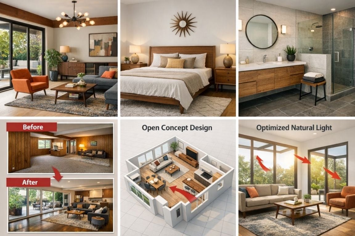 A homeowner had an outdated mid-century house with small rooms and poor lighting. Instead of rebuilding, they went for a mid-century modern remodel.